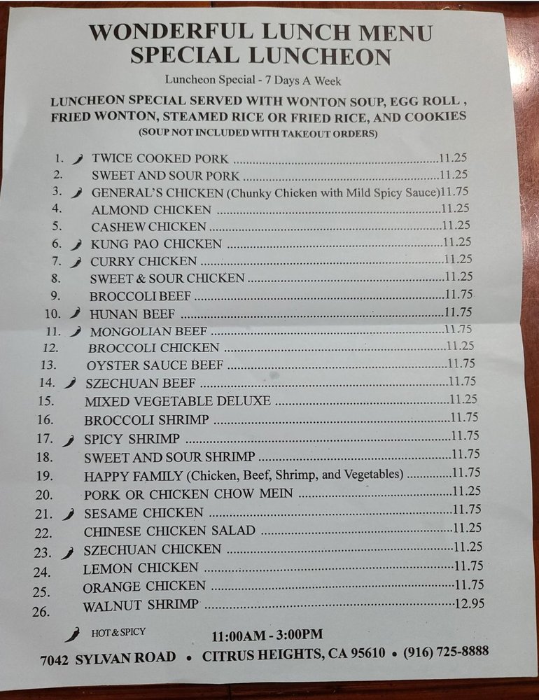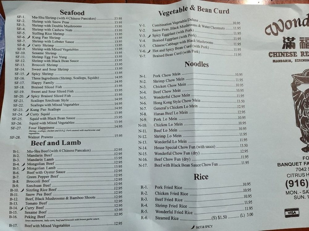 With a variety of amenities like outdoor seating, beer and wine options, and happy hour deals, Wonderful Chinese Restaurant caters to all preferences. Don't miss out on this gem in Citrus Heights for a taste of authentic Chinese cuisine.