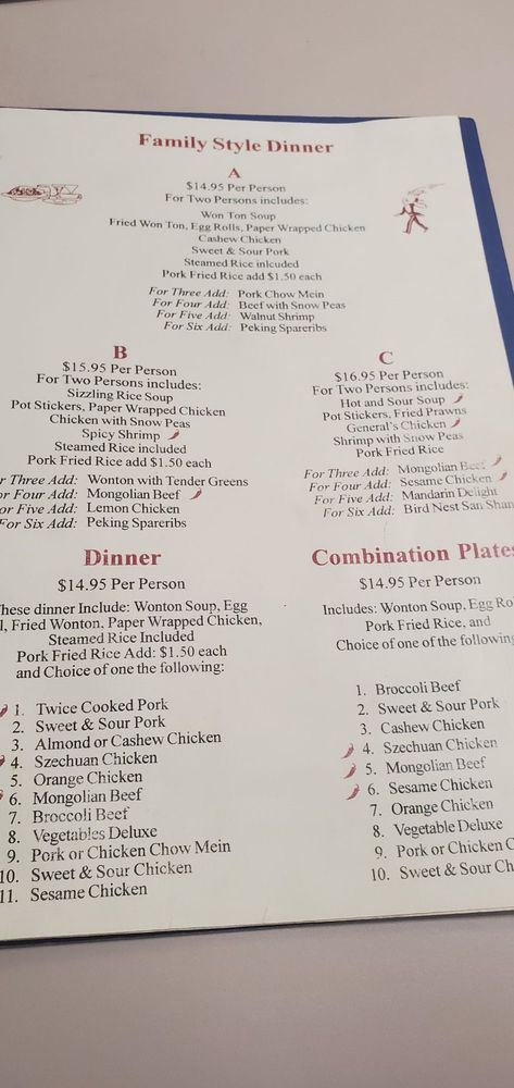 For Two Persons Includes: Won Ton Soup, Fried Won Ton, Egg Rolls, Paper Wrapped Chicken, Cashew Chicken, Sweet & Sour Pork, Steamed Rice included. pork Fried Rice add $1 each, For Three Add: Pork Chow Mein, For Four Add: Beef with Snow Peas, For Five Add: Walnut Shrimp, For Six Add: Peking Spareribs